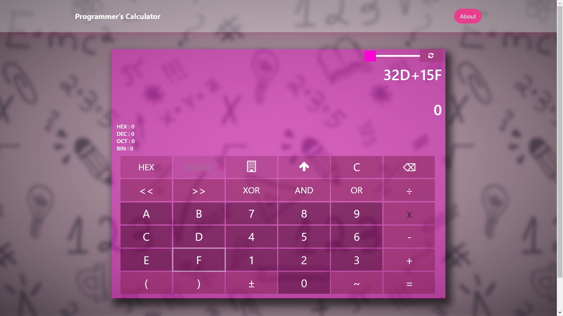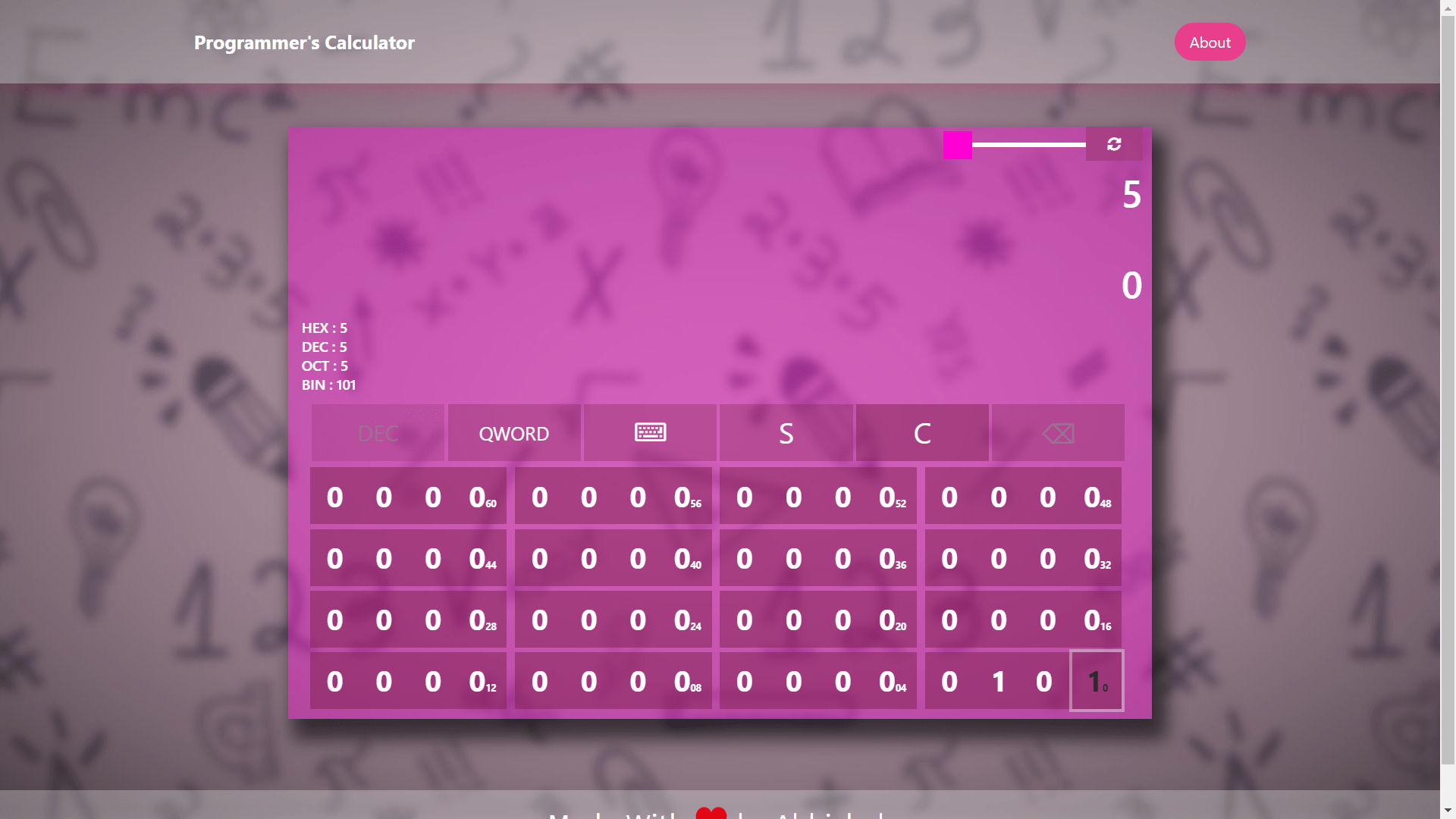 The Programmer's Calculator is a versatile web application I developed using HTML, CSS, and JavaScript. It empowers users to perform calculations in Decimal, Binary, Octal, or Hexadecimal bases, making it an invaluable tool for programmers and tech enthusiasts. Additionally, it offers bitwise operators and a bit mode for precise bit-level manipulations, catering to a wide range of digital computing needs. This project demonstrates my proficiency in web development and showcases my ability to create user-friendly and functional tools for specific technical tasks.